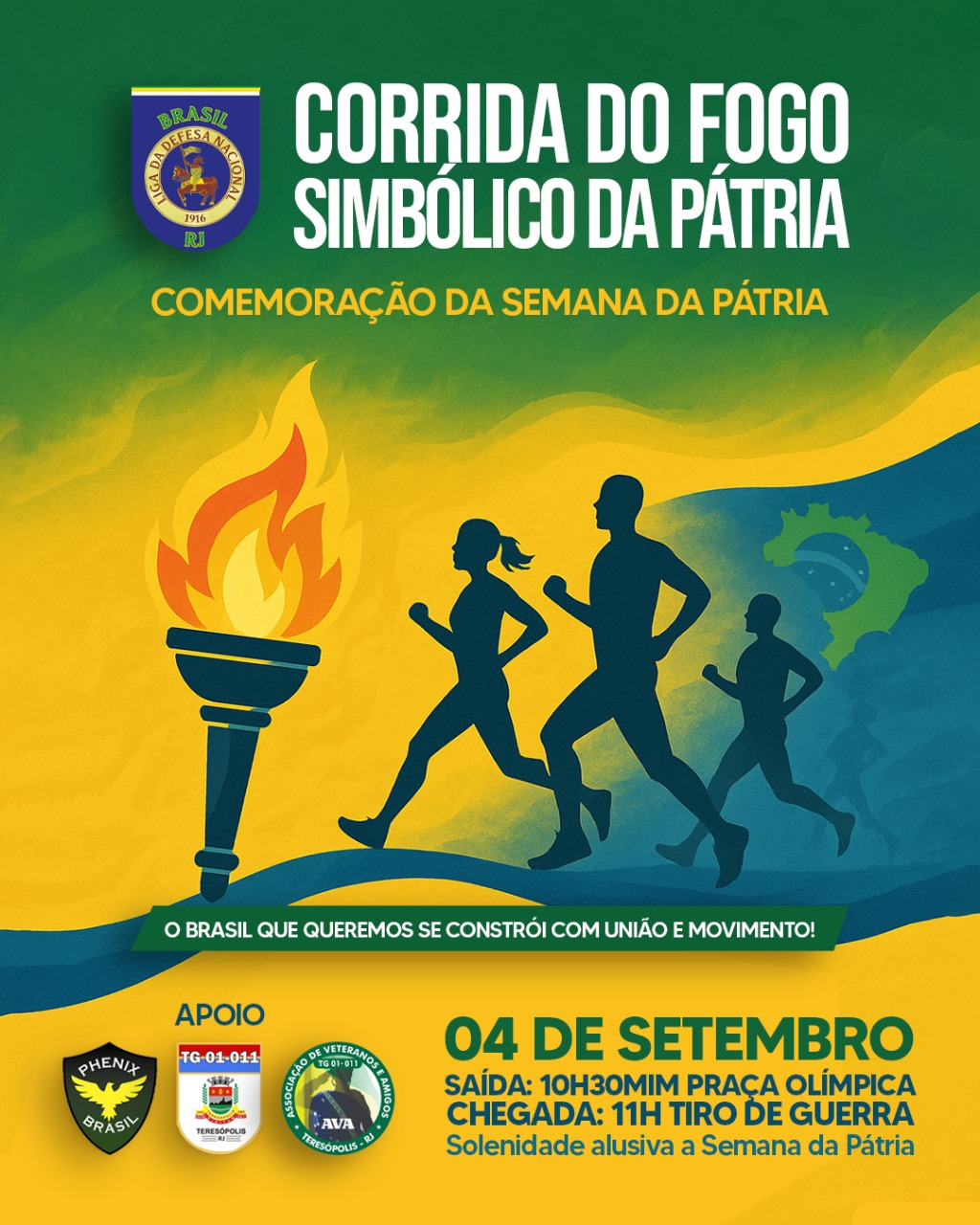 Teresópolis se prepara para receber, no próximo dia 4 de setembro, um evento especial que promete reforçar o sentimento de orgulho nacional e valorizar a história do país. Trata-se da Corrida do Fogo Simbólico da Pátria, organizada pela Liga da Defesa Nacional – Diretoria Estadual do Rio de Janeiro, com apoio do Grupo Phenix Brasil, da Associação dos Amigos e Veteranos do TG 01-011 e do Tiro de Guerra de Teresópolis.